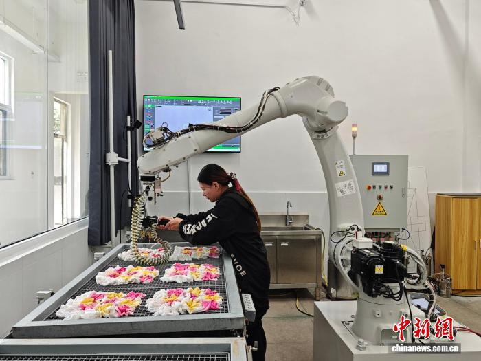 科技赋能带来了显著的产业变革。每条生产线上的“智能工匠”工作量堪比5名工人,可替代30%的扎染工序,将生产效率提升6倍;染料利用率从60%跃升至92%,正品率高达98%,同时大幅降低废水排放,实现了经济效益与绿色发展的双赢。